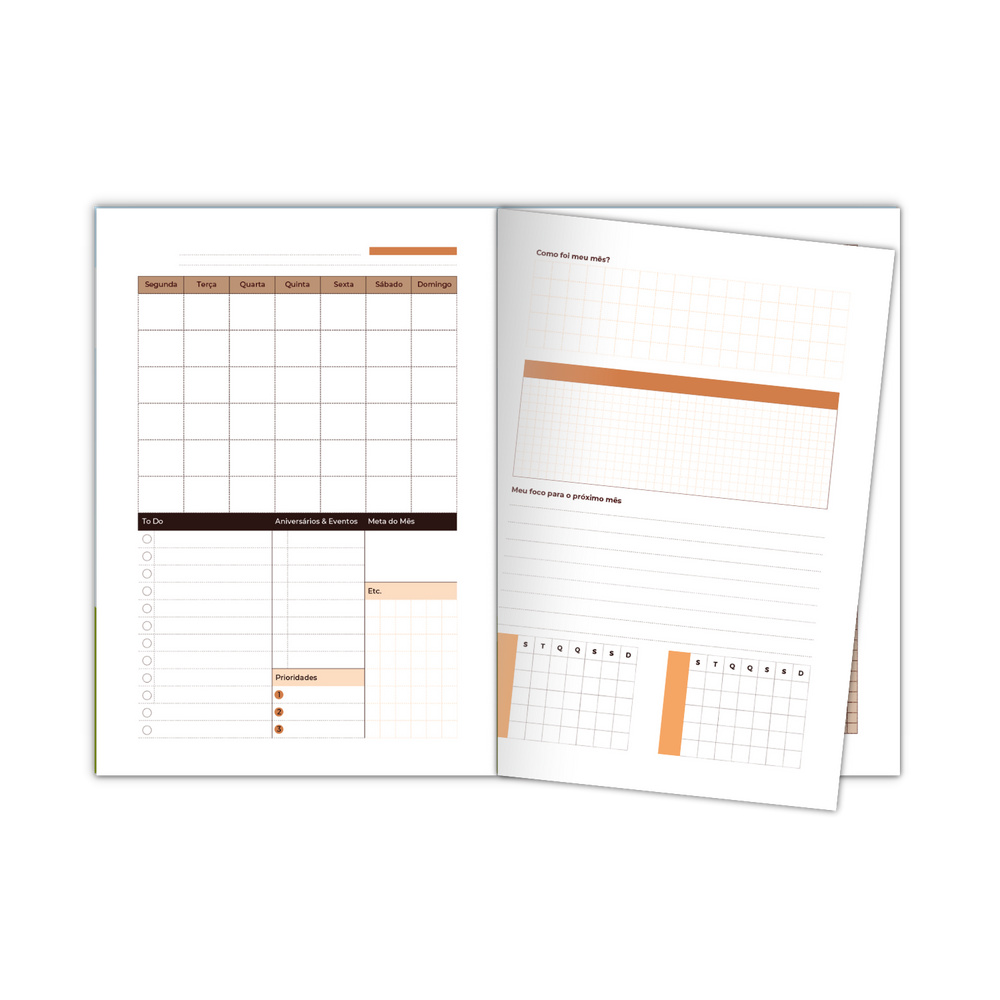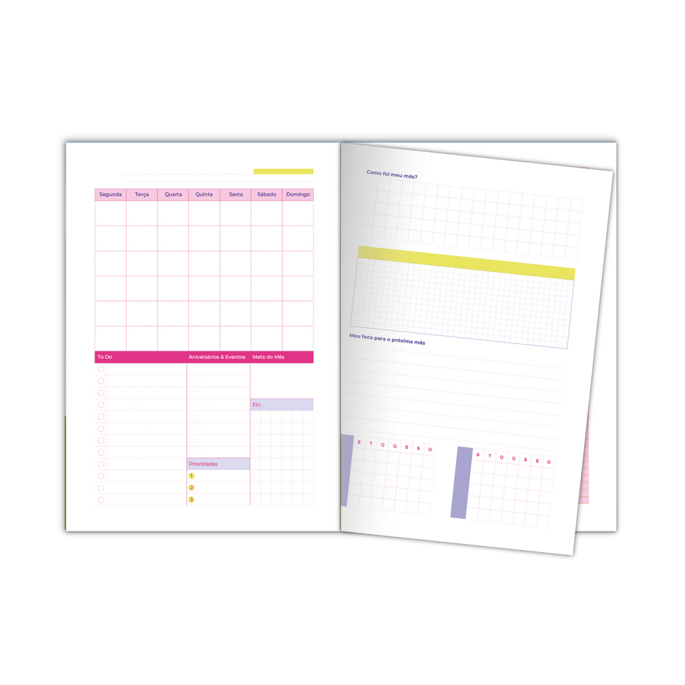 Conteúdo: caderneta mensal permanente com visão clara do mês e espaços funcionais para planejar, revisar e ajustar o foco. O miolo traz quadrantes mensais para compromissos e metas, listas e campos de prioridade, com estrutura compacta que facilita o uso de cores e marcações. O layout leve e equilibrado ajuda a distribuir tarefas e visualizar o progresso mês a mês.