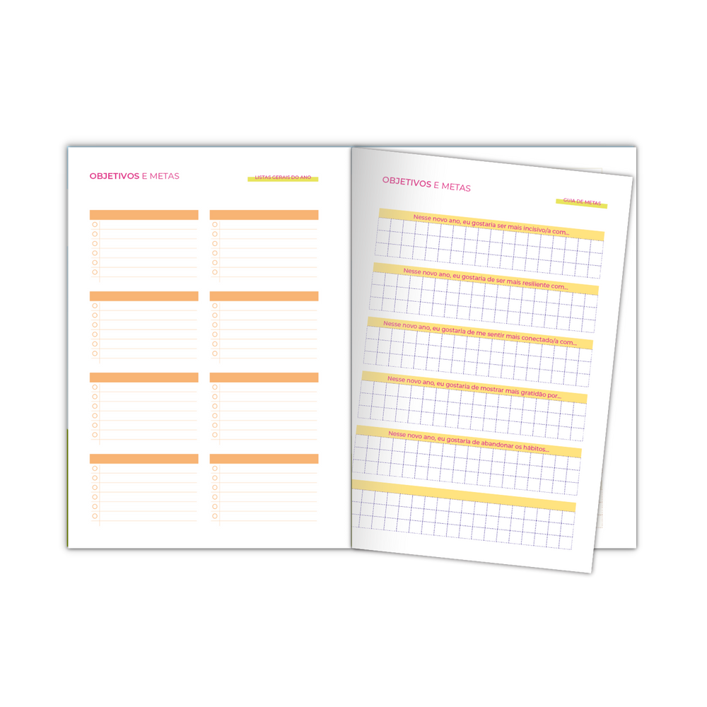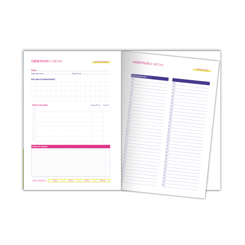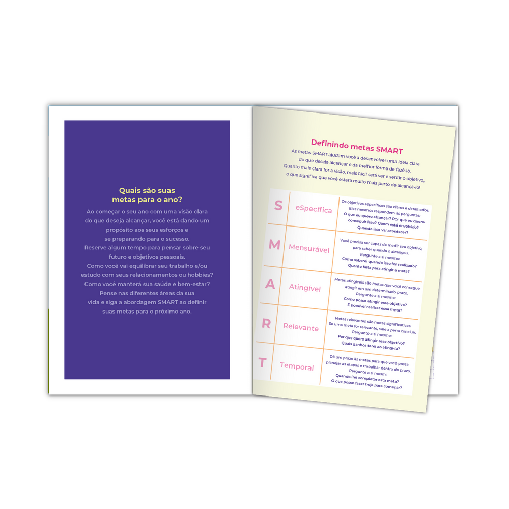 Conteúdo: caderneta de metas permanente com layout leve e seções pensadas para foco e acompanhamento contínuo. Reúne explicação do Método SMART, guia de metas, resoluções do ano, listas gerais e de tempo livre, metas mensais (não datadas), roda da vida, dez páginas de plano de ação e vision board. Tudo em um formato intuitivo que ajuda a dividir grandes objetivos em etapas menores e acompanhar o progresso de curto, médio e longo prazo.